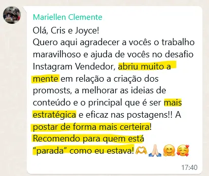 E a melhor parte é que essa aluna aplicou as ações do desafio sozinha, organizou seu perfil em poucos dias e já começou a criar conteúdos mais estratégicos, atraindo o público certo com mais segurança e clareza na hora de vende